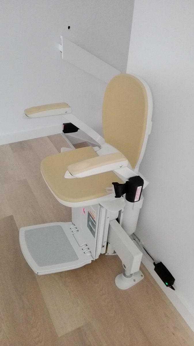 Ideal para instalar en una residencia privada, la silla CURVE es un sistema de elevación, diseñado y homologado sobre la base de la Directiva de Máquinas 2006/42 CE, que no exige ningún tipo de obras de instalación. Presenta un asiento abatible y acolchado comodísimo y reposabrazos y reposapiés plegables, mandos de pulsación en el reposabrazos y en la pared sin ningún tipo de cables que puedan estorbar.