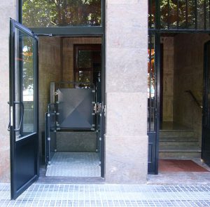 La plataforma vertical Silver, es un elevador adecuado tanto para instalación en interiores como a la intemperie. Sus tres versiones Silver-S, Silver-L y Silver -XL le permiten adaptarse al ámbito público o privado. Es una gran opción como salvaescaleras para portales, como podemos ver en esta instalación realizada en San Sebastián.
