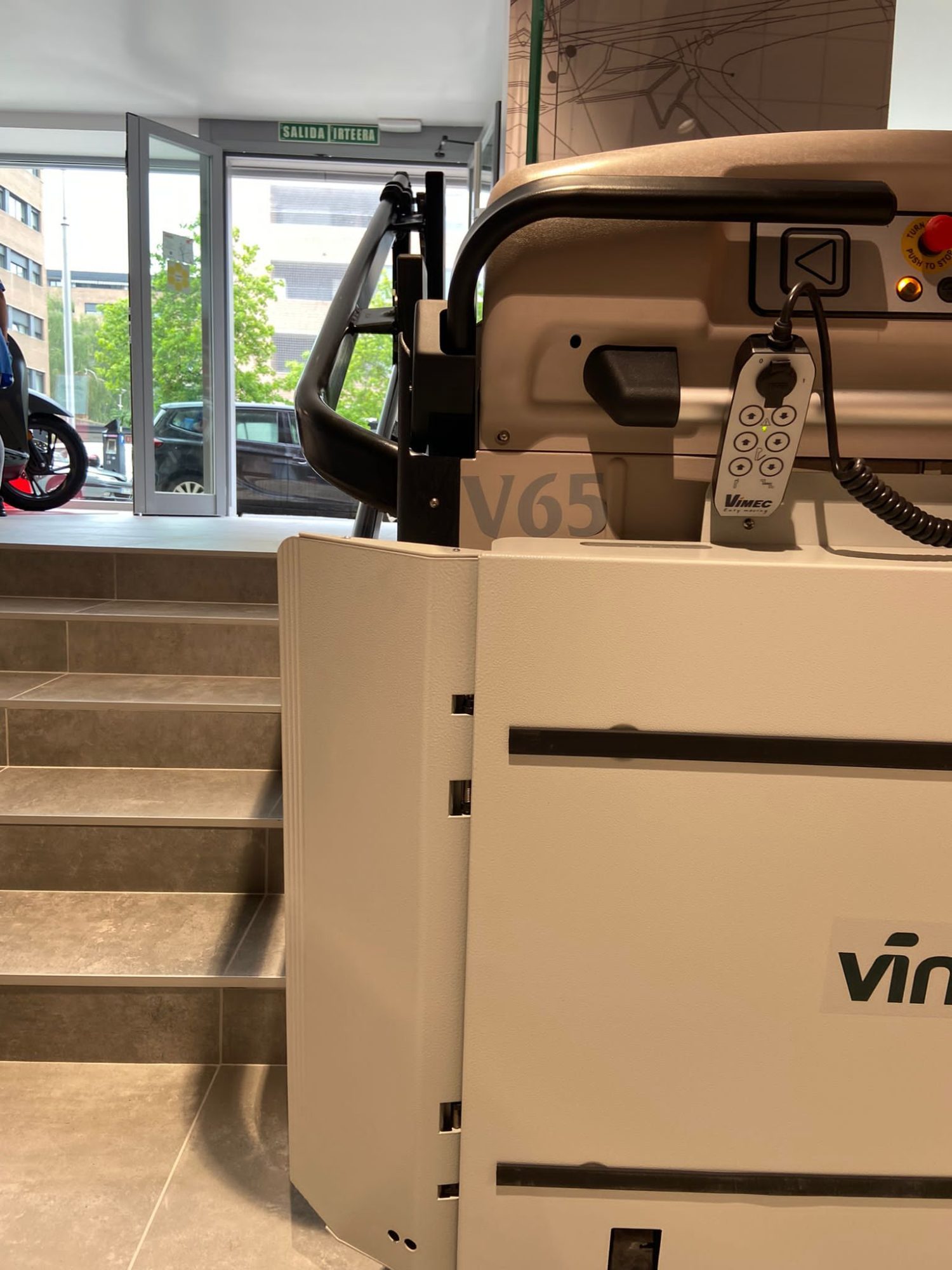 Consiste en una plataforma que se mueve a lo largo de una guía o carril fijado a la escalera, permitiendo a la persona sentarse o permanecer de pie en ella mientras es transportada de un nivel a otro.